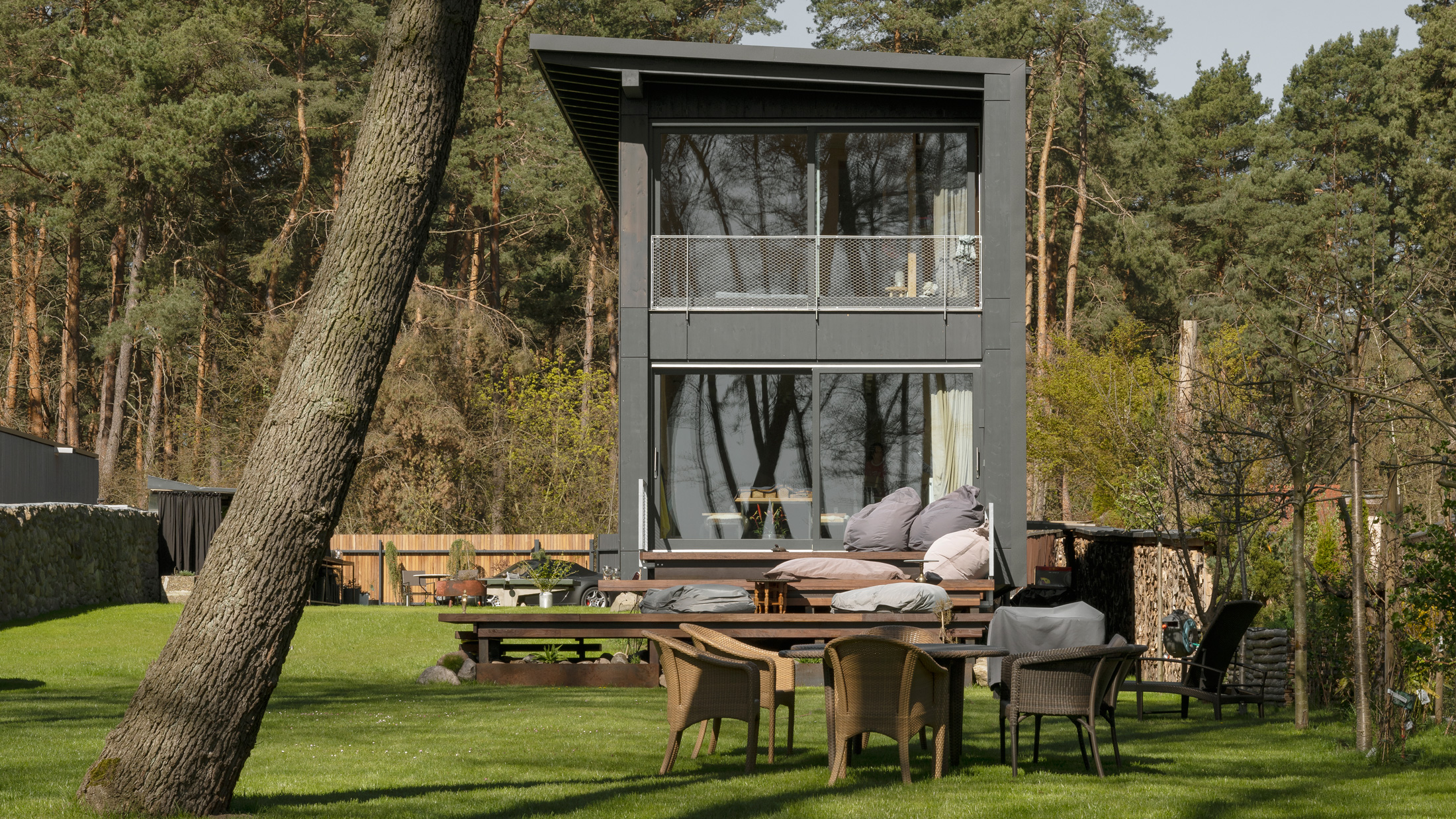 Konsequent nach Norden und Süden ausgerichtet und demonstrativ im Wechsel von Massivbauweise und Skelettbau ausgeführt, ist es ein solares Haus des Low Tech. Hinter seinem radikal minimierten Tragwerk aus Stäben und Zugseilen öffnet es sich mit seiner durchgängigen, zweischaligen Glasfront großzügig nach Süden, während sich entlang der kalten Nordseite eine hochgedämmte, fast geschlossene hölzerne Fassade erstreckt, die sich dort nur die Öffnung eines schmalen Lichtbandes erlaubt.