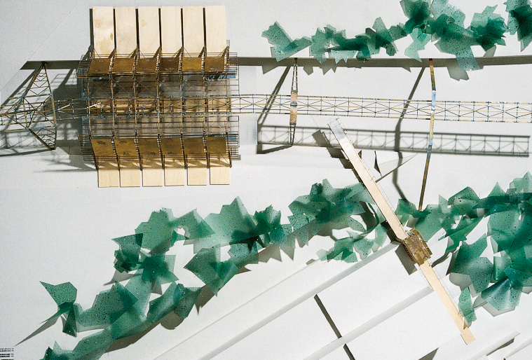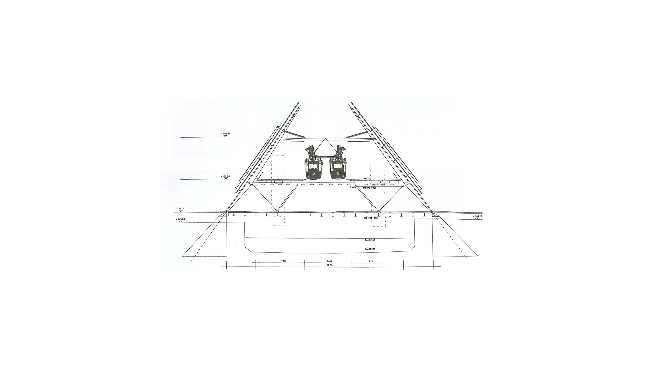 The entire structural framework is divided into longitudinal planar structures, which are stiffened by compression pipes both at the platform level and above the tracks, as well as by cable tensioning. Each structural frame consists of a pair of cantilevered external supports, inclined in alignment with the frames of the track carriers. These supports bear the facade and are shaped according to their bending loads. Together with a story-high truss below the distribution level, they form a tensioned structural system.