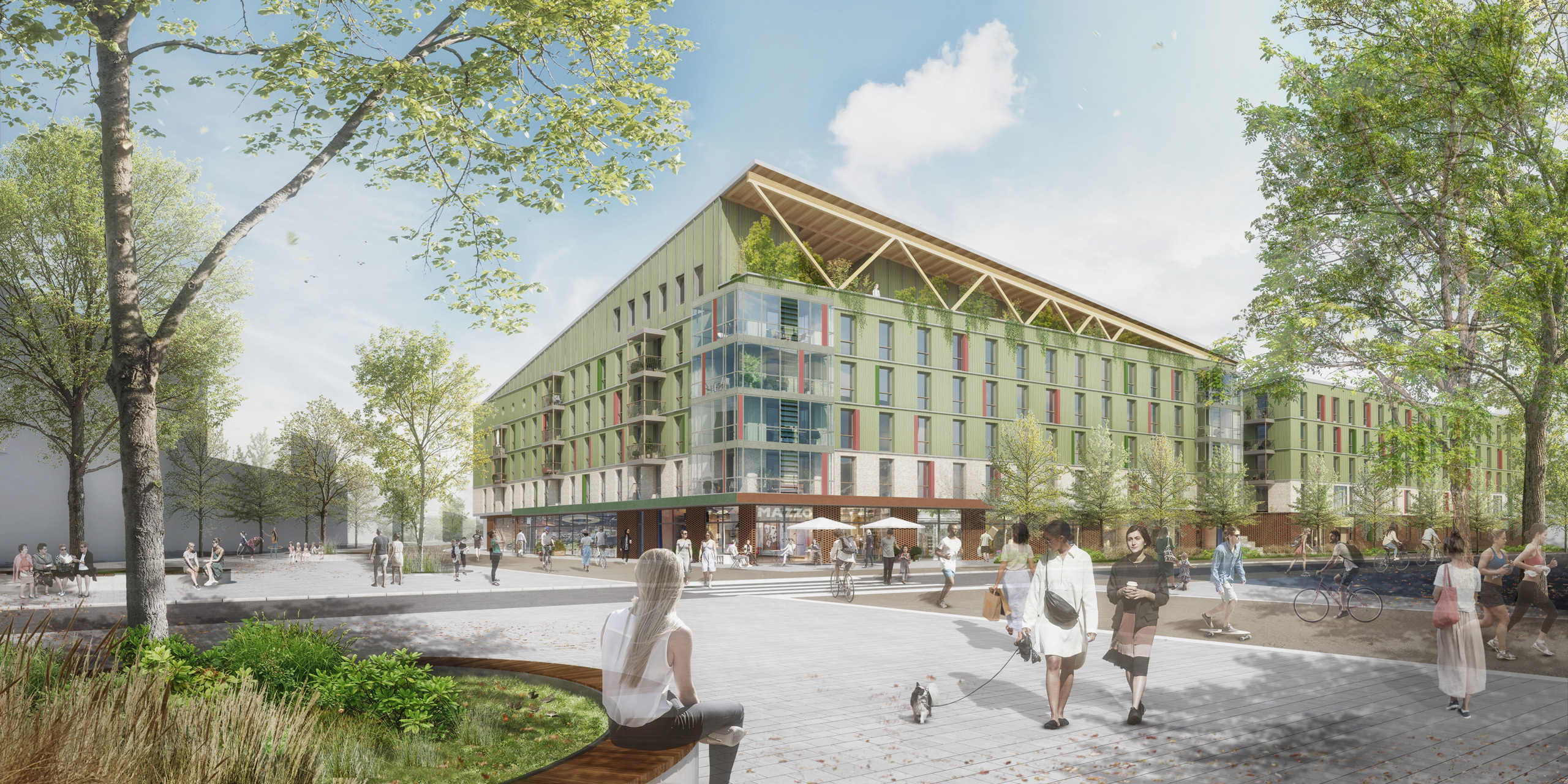 The design puts cyclists and pedestrians at the forefront and hides cars underground. Paths are perceived as play areas. To support the bike-friendly city, parking spaces for bicycles, including cargo bikes, are distributed throughout the entire area.