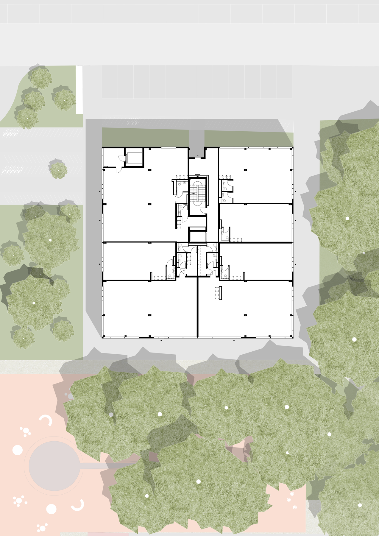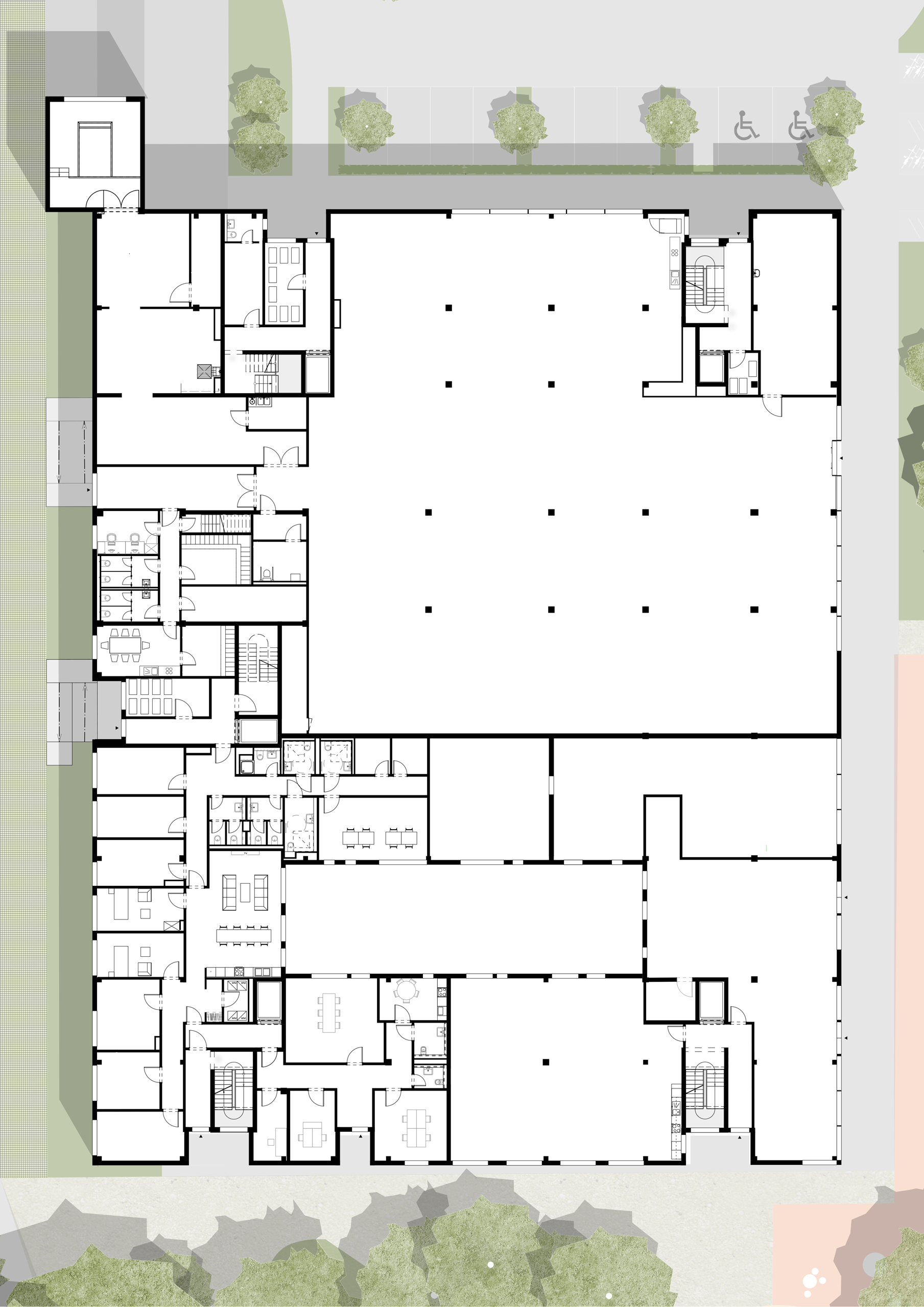 The single-storey former canteen building has three storeys with different storey heights, the outer wall is made of standardized aerated concrete elements in free laying with different widths, lengths and thicknesses. A particularly cost-effective construction that can be budgeted at just €280/m² GFA (columns, beams, ceiling panels, façade elements).
