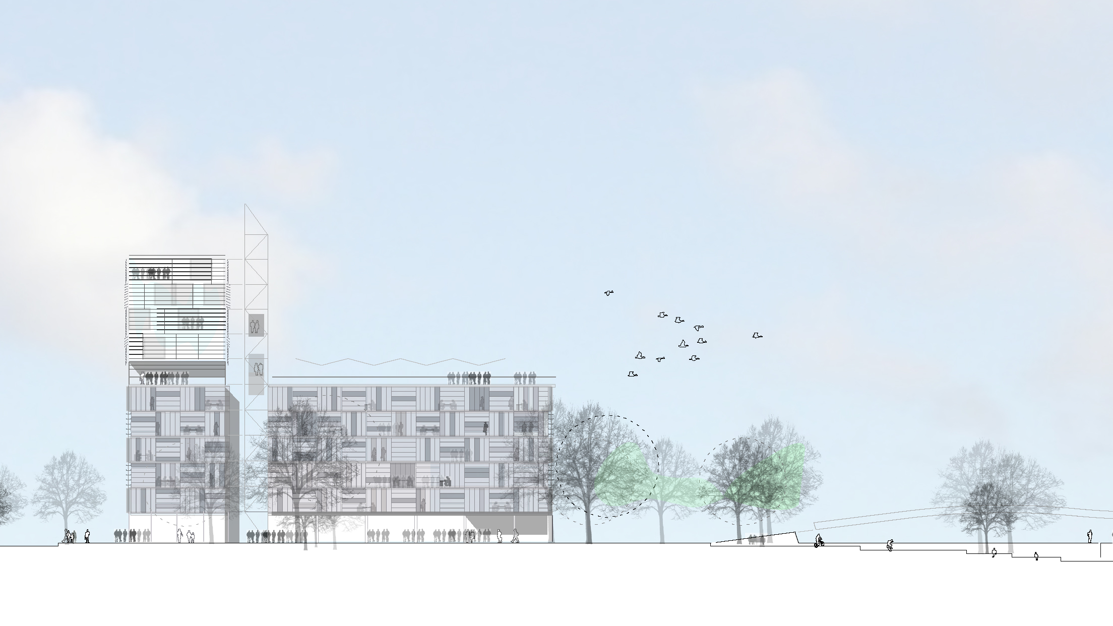 The design puts cyclists and pedestrians at the forefront and hides cars underground. Paths are perceived as play areas. To support the bike-friendly city, parking spaces for bicycles, including cargo bikes, are distributed throughout the entire area.