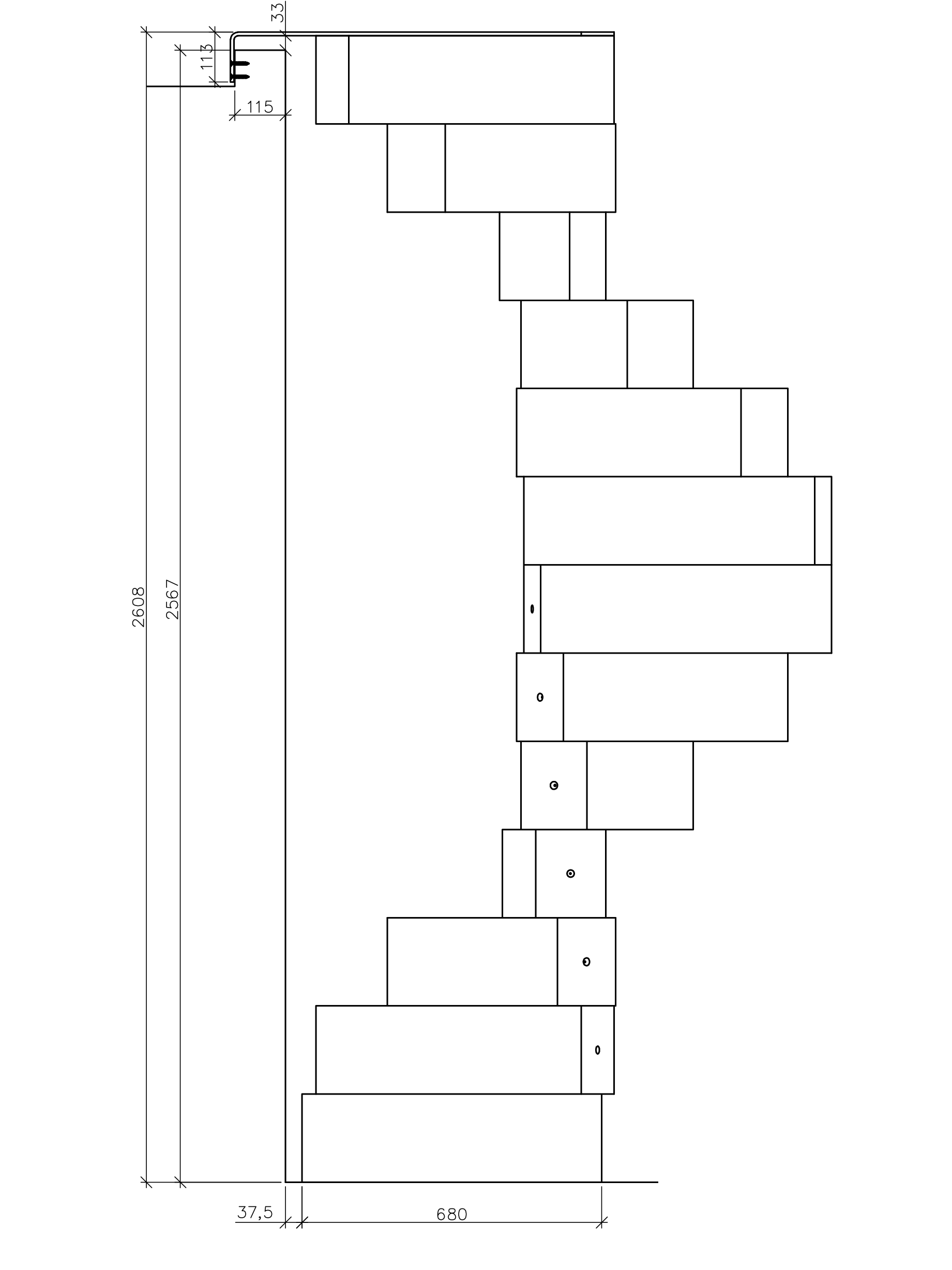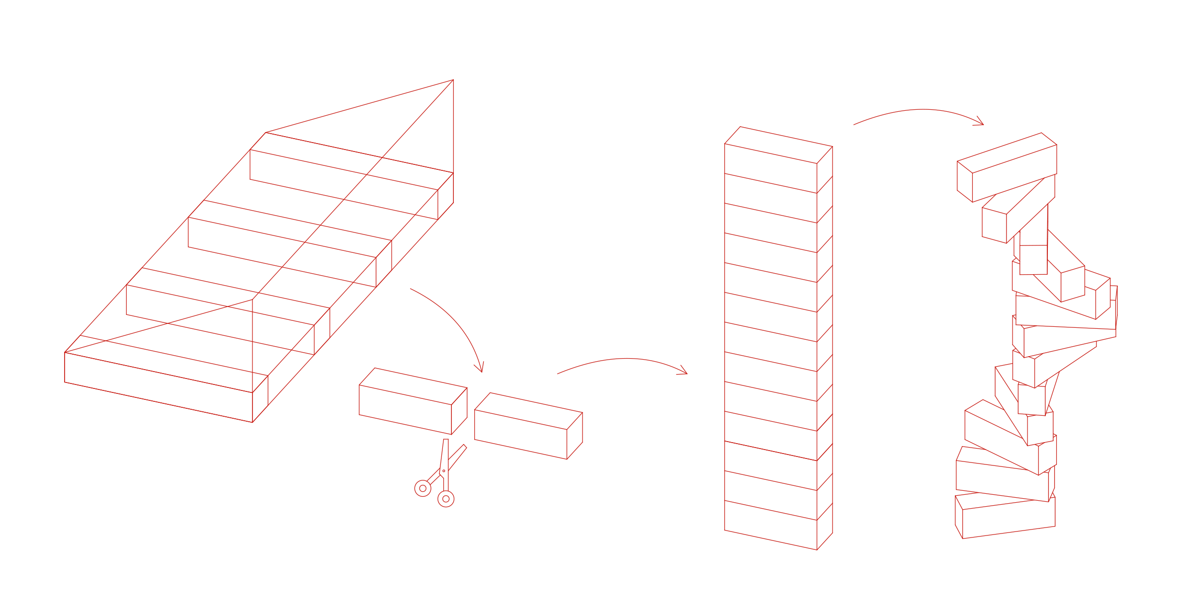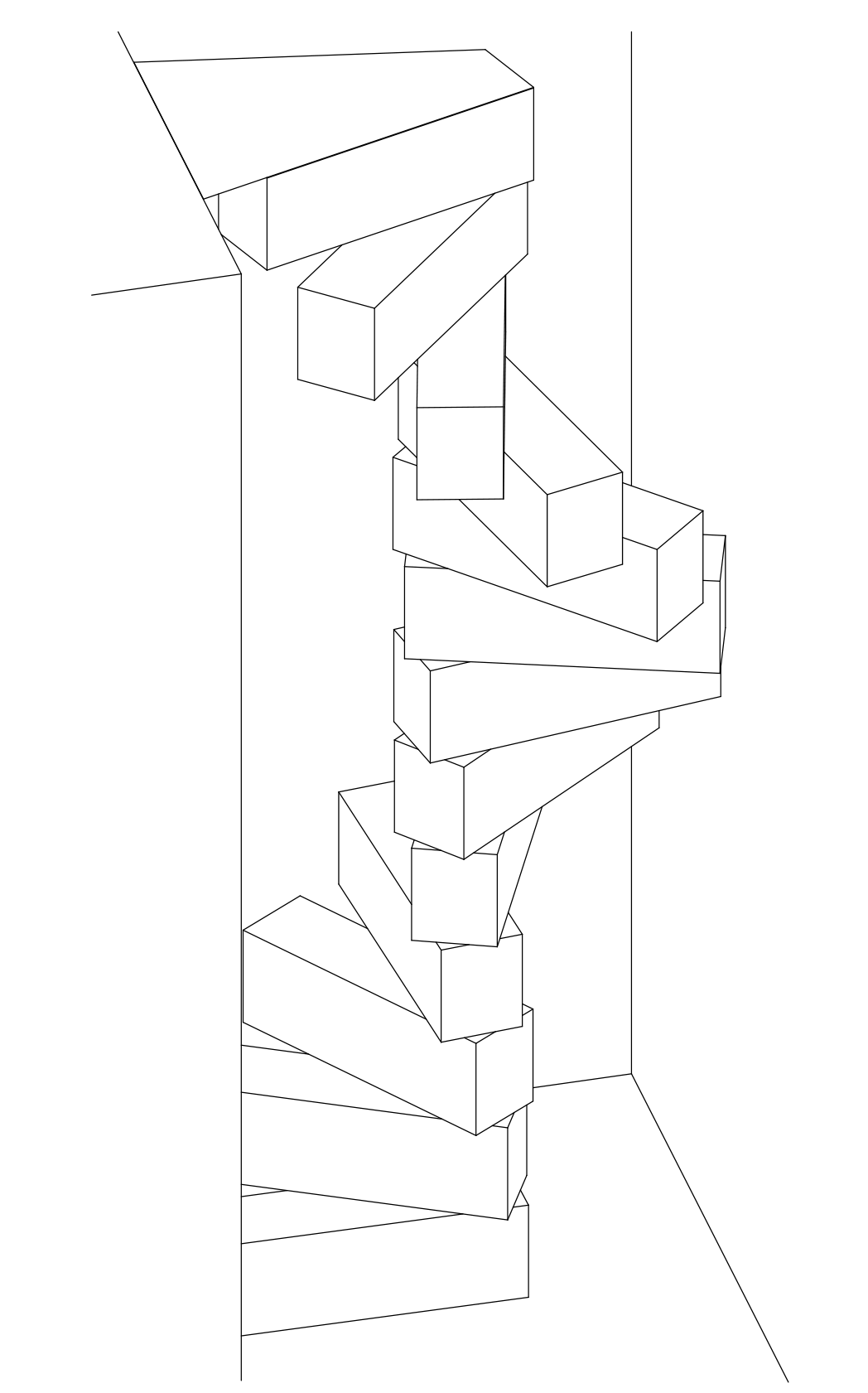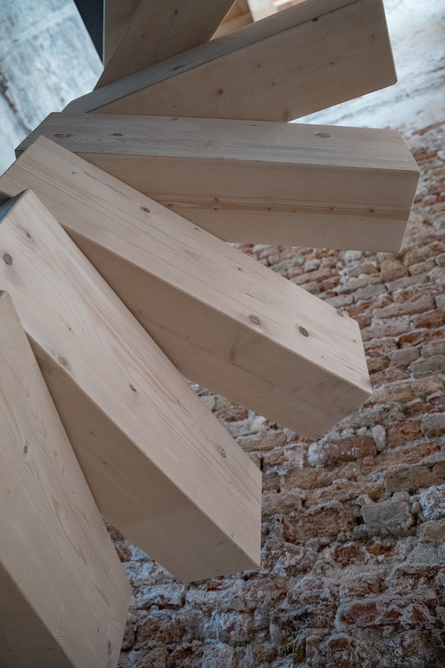 The steps are made from solid material — rough timber that was once part of the building in another form. After being shaped in the carpenter’s workshop, they now coil around a central axis like protagonists in a pole dance. The staircase is less a conventional construction than a massive torsion: at first glance a sculptural object, only revealing itself as a staircase upon closer inspection.
