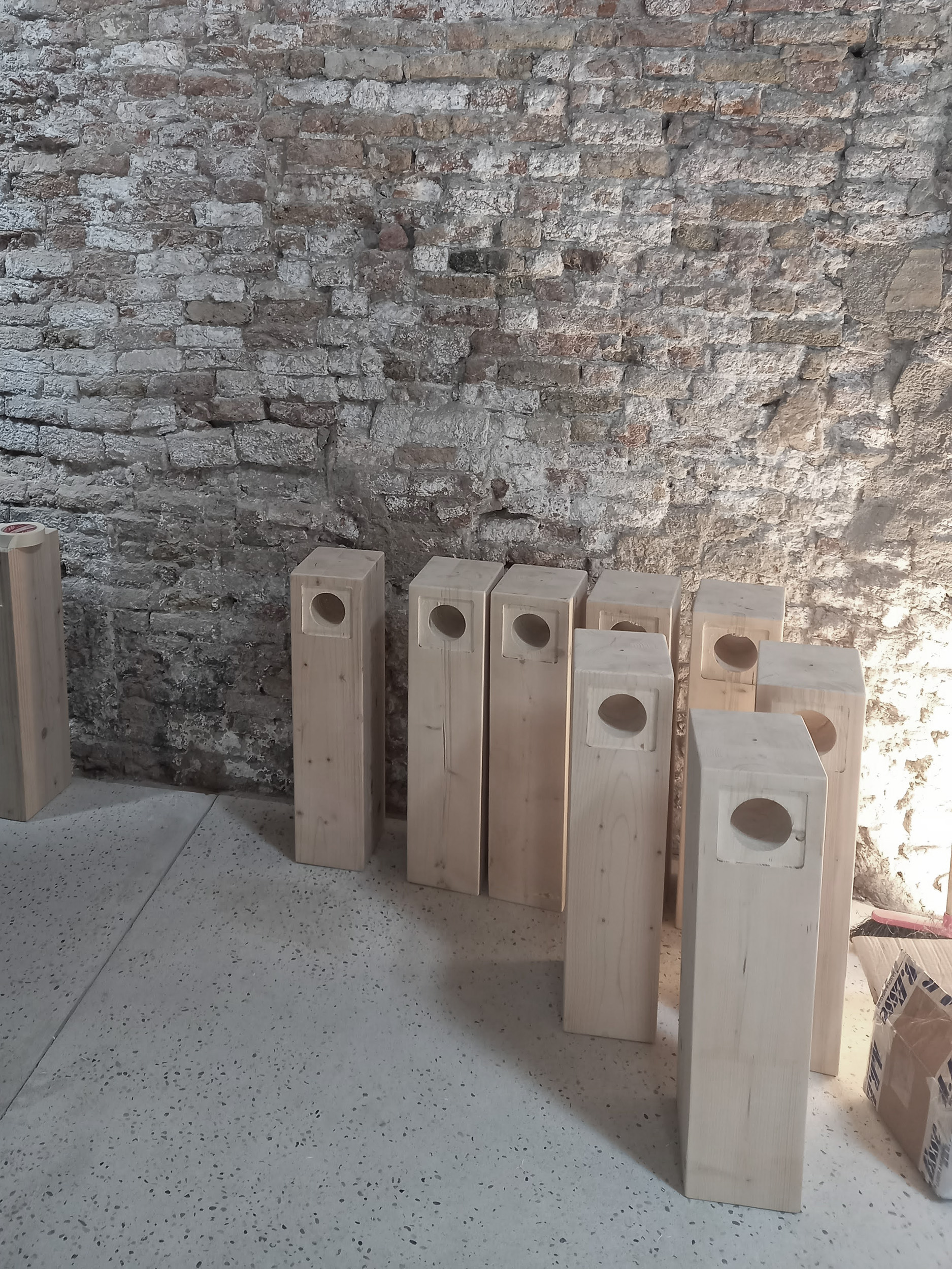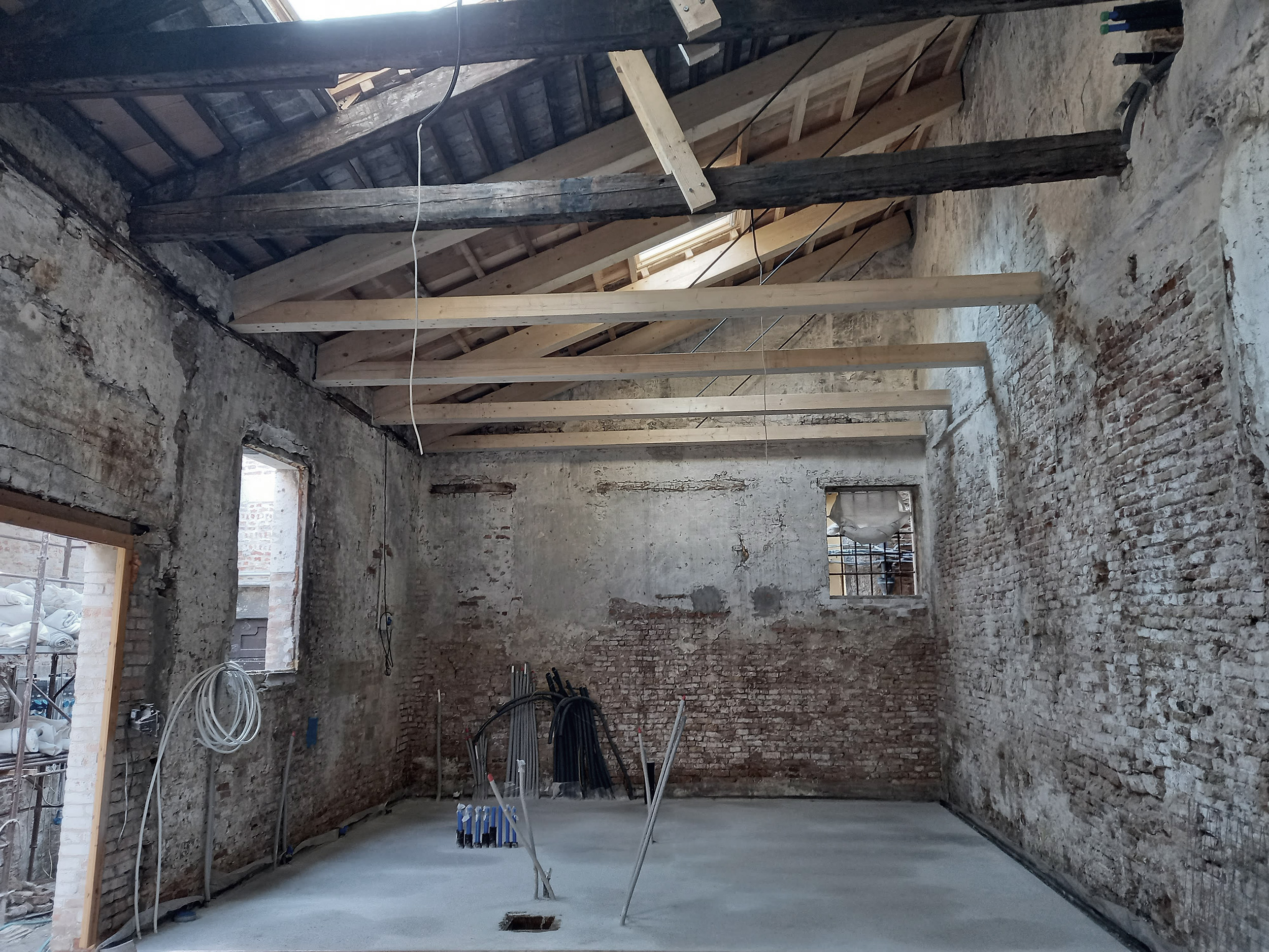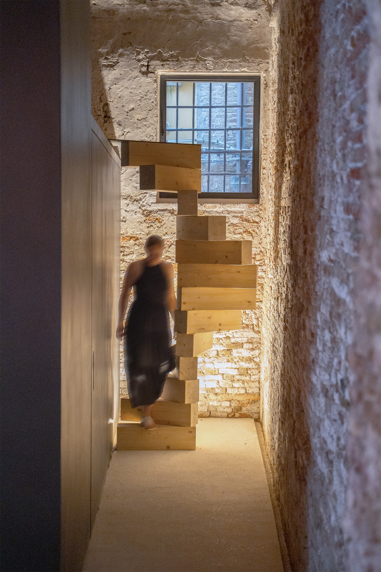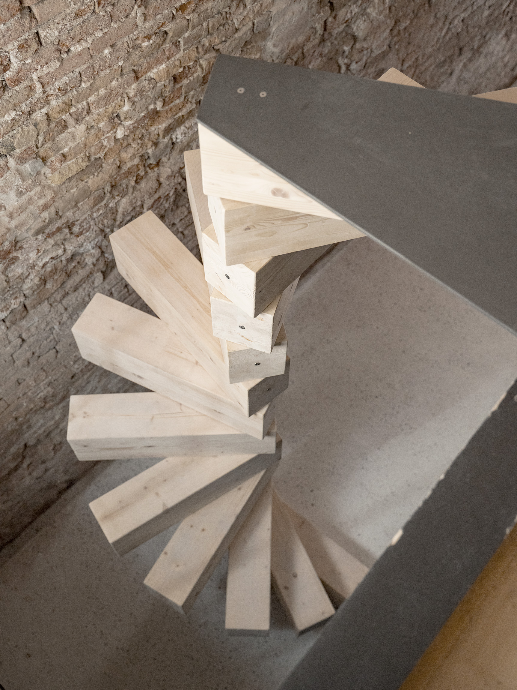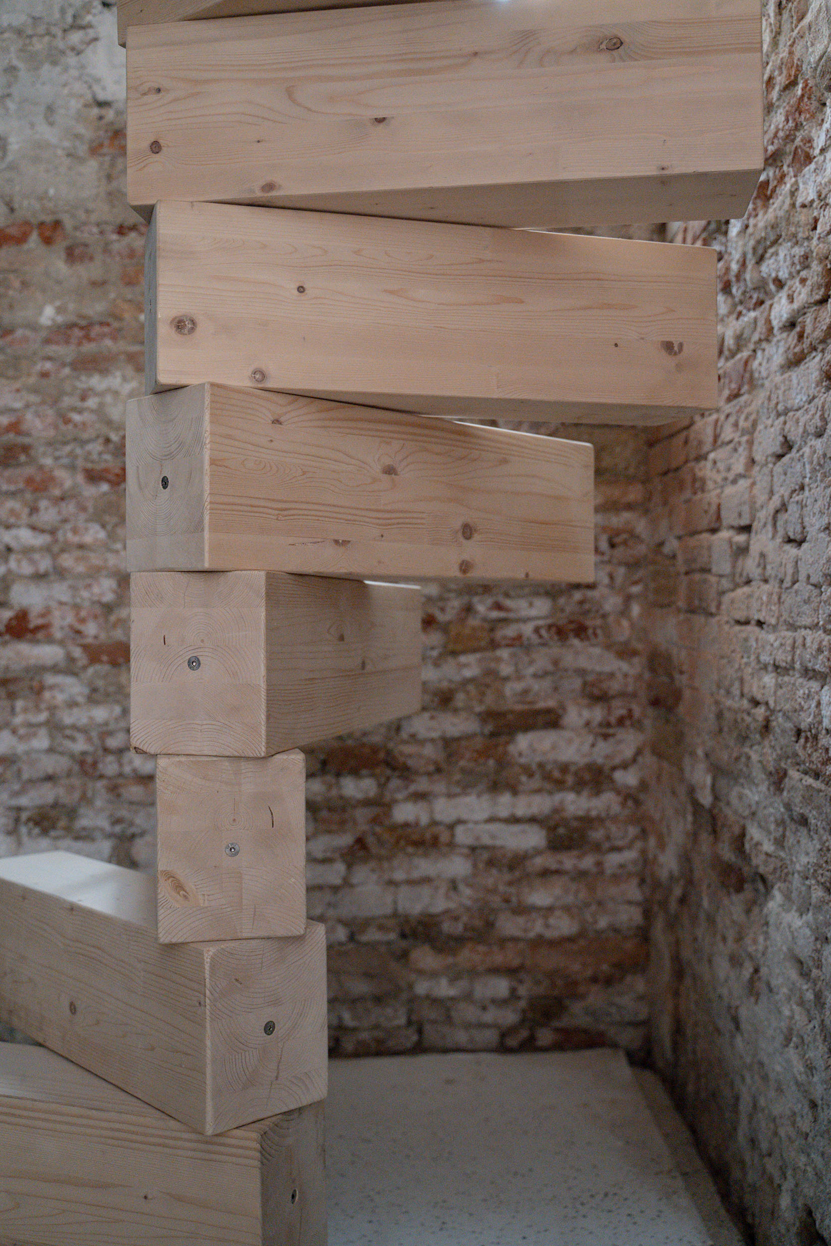 A distinctive, sculptural figure emerged — reshaped from the redundant beams of the roof structure, entirely in the spirit of circular building practice, which has been naturally and intuitively practiced in Venice for centuries, long before the term itself was coined.