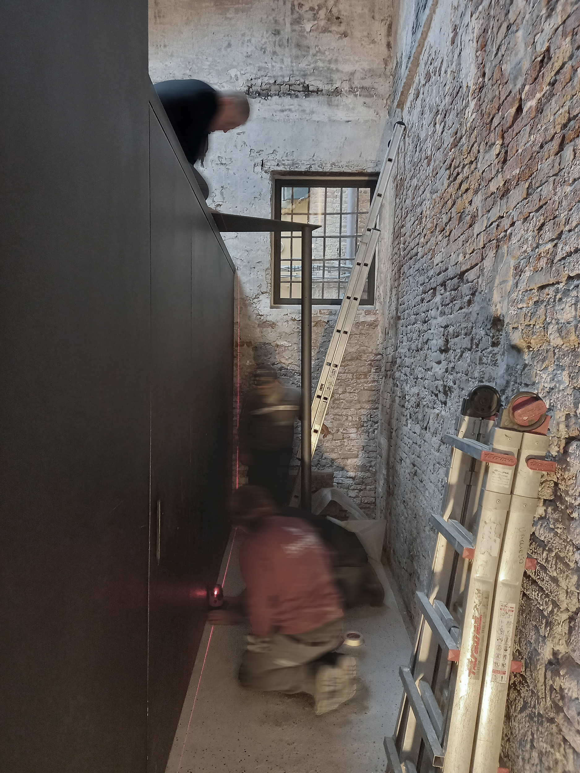 The spiral staircase provides safe access to a gallery, offering visitors of the Salone Verde new perspectives on the exhibited works. As they ascend, visitors move through layers of historical masonry, past reopened window apertures and exposed architectural details that would otherwise remain unseen — thus rediscovering historical spaces for themselves.