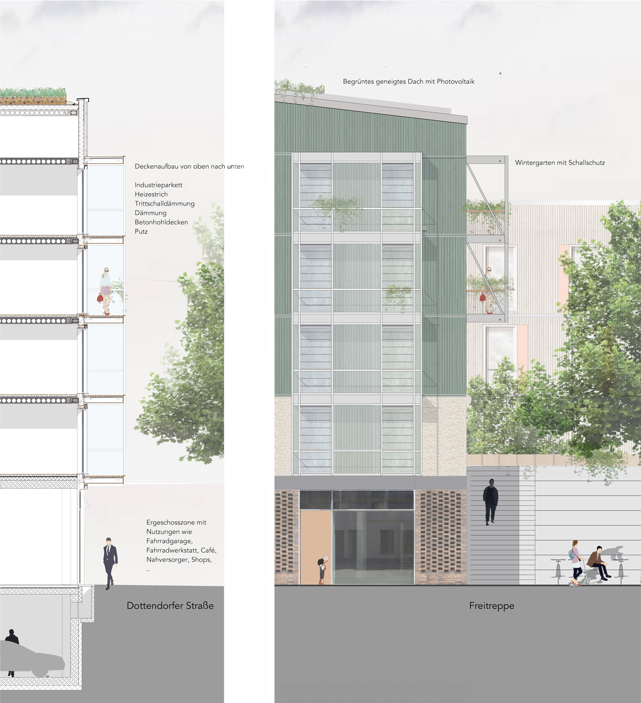 Along Dottendorfer Straße, the buildings lining the street protect the neighborhood. Here, the apartments are interconnected, with balconies facing the inner courtyards and cross ventilation. This gives each apartment access to the quiet, sun-drenched interior of the neighborhood. Along Dottendorfer Straße, a bike mobility hub and commercial spaces are located on the ground floor. A partially green façade acts as a sound absorber against the expected traffic noise.