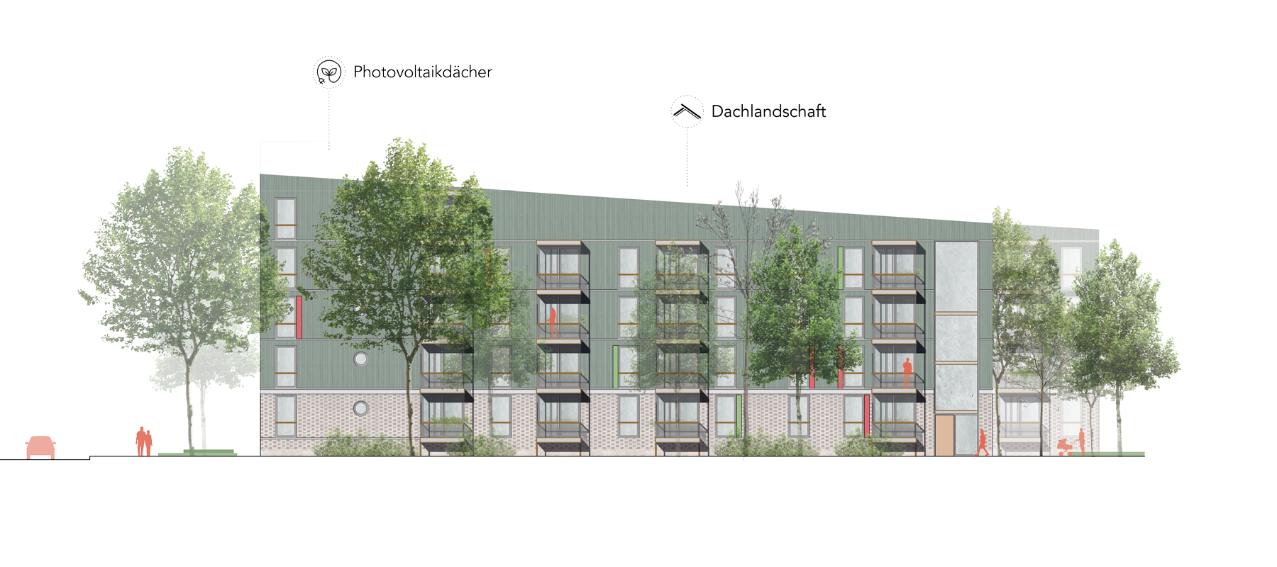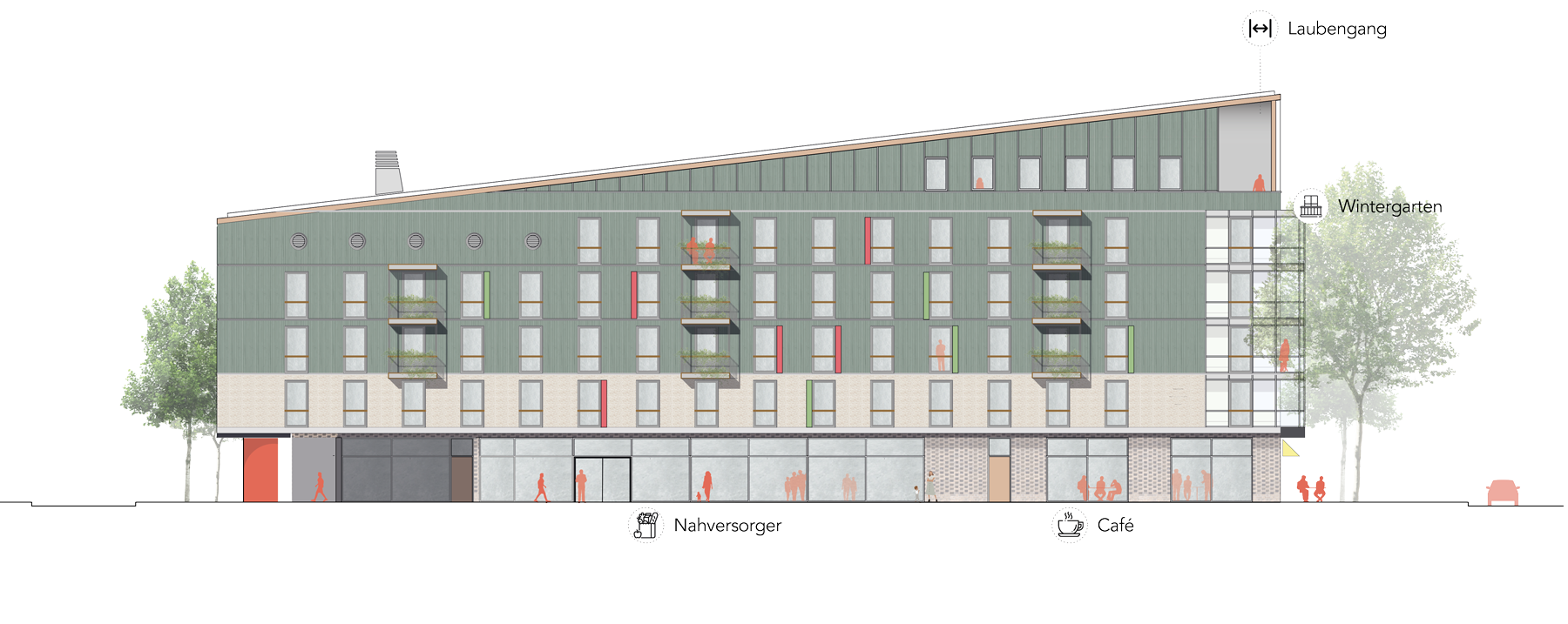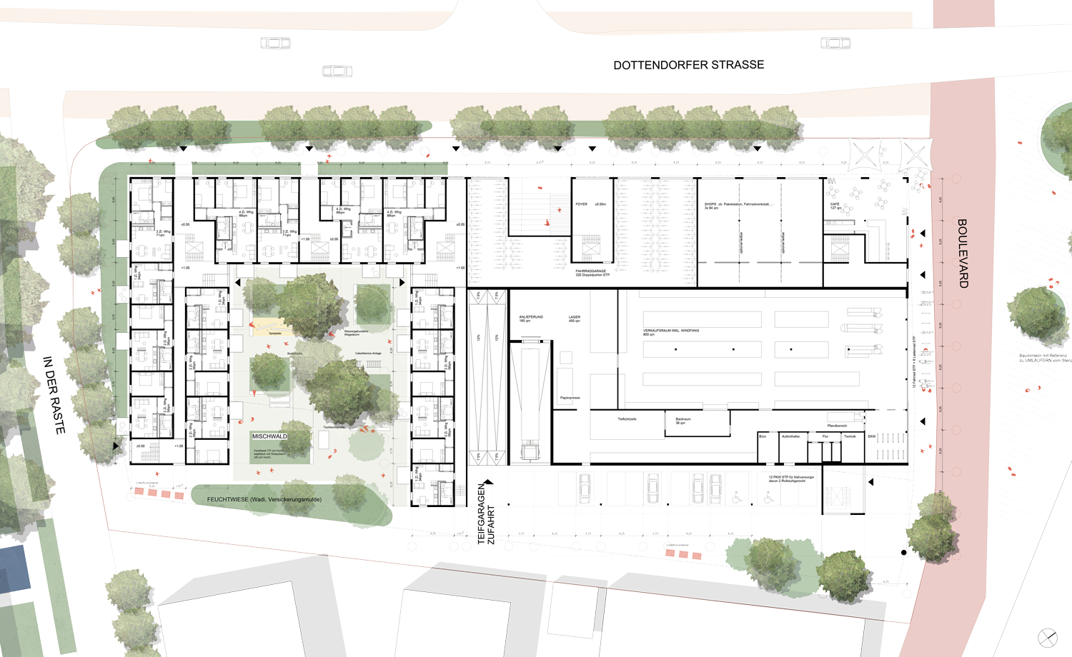 All building entrances face public spaces – Dottendorfer Strasse and Boulevard. The entrances are barrier-free and easily accessible for wheelchair users. The roof above the supermarket is a roof garden and distribution area for the stairwells, which cannot be extended to the ground floor due to commercial use. The roof garden is an informal meeting place for the building community. The entrance to the garage is located on the east side of the building, parallel to the delivery area for the retail space. There are also 12 short-term parking spaces for supermarket customers here. Along Dottendorfer Strasse, a bicycle garage with a bike mobility hub and, if necessary, a bicycle repair shop with rental facilities is being built on the ground floor.