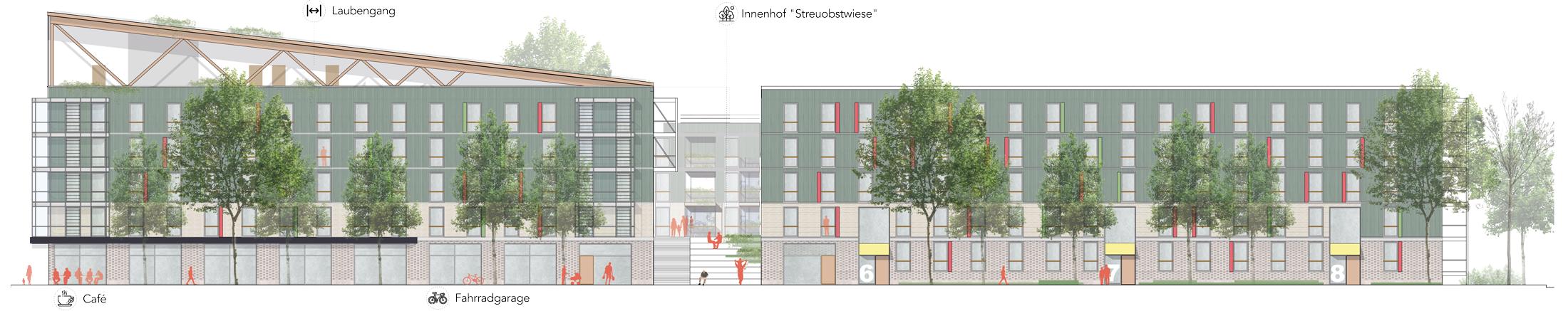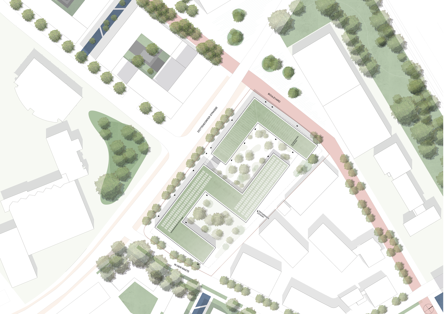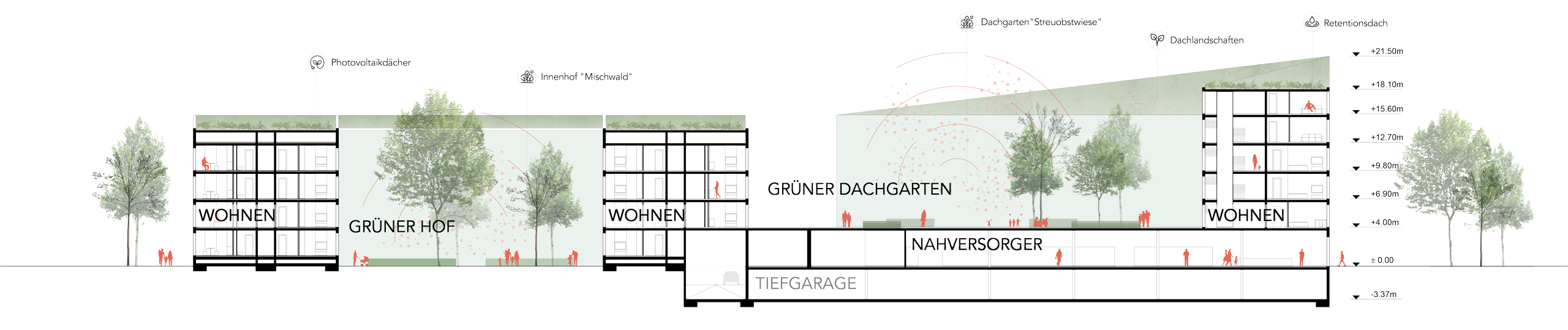 All building entrances face public spaces – Dottendorfer Strasse and Boulevard. The entrances are barrier-free and easily accessible for wheelchair users. The roof above the supermarket is a roof garden and distribution area for the stairwells, which cannot be extended to the ground floor due to commercial use. The roof garden is an informal meeting place for the building community. The entrance to the garage is located on the east side of the building, parallel to the delivery area for the retail space. There are also 12 short-term parking spaces for supermarket customers here. Along Dottendorfer Strasse, a bicycle garage with a bike mobility hub and, if necessary, a bicycle repair shop with rental facilities is being built on the ground floor.