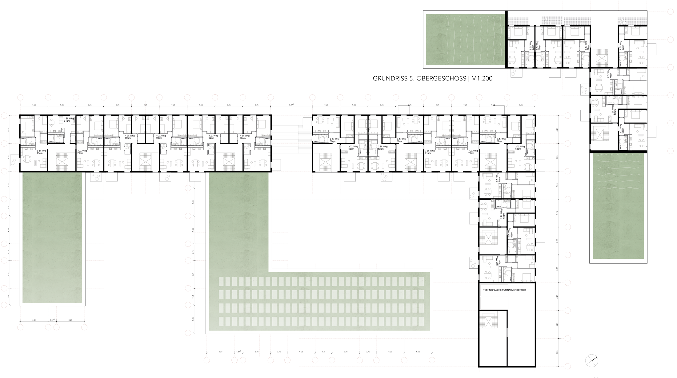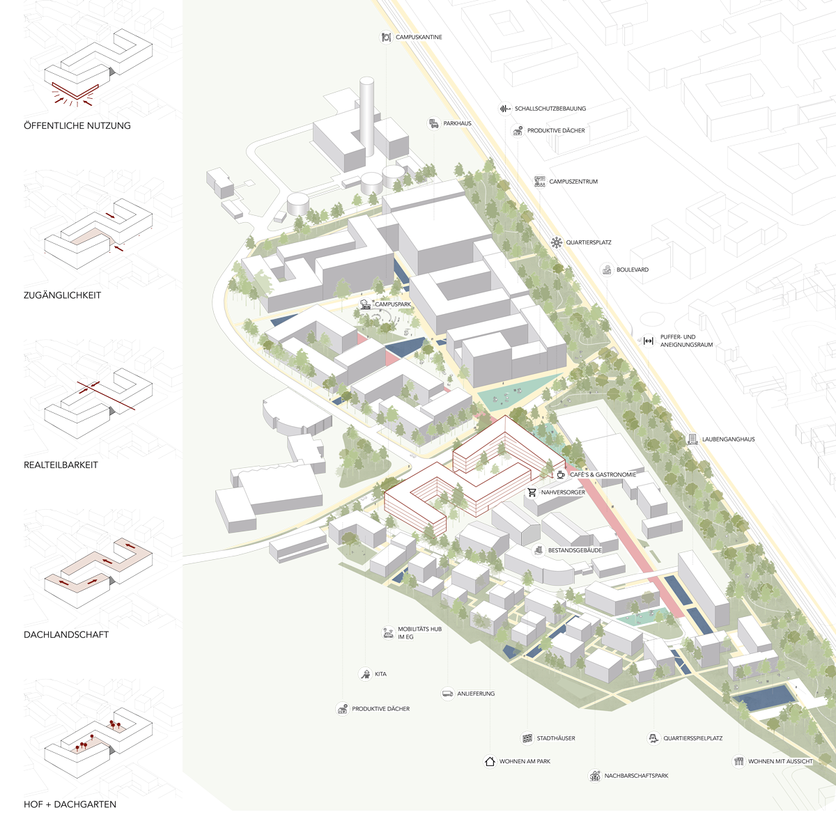 The north courtyard has a basement – with retail space and additional commercial use (facing the public streets) on the ground floor and an underground car park in the basement that covers all parking requirements. The south courtyard has no basement and is completely open to drainage. All roofs are sloped – a significant roof landscape with greenery and PV, a fifth façade, robust and with secure drainage. This creates an ObenLand, shaping this location. The buildings could be realized in two construction phases or divided into real parts.