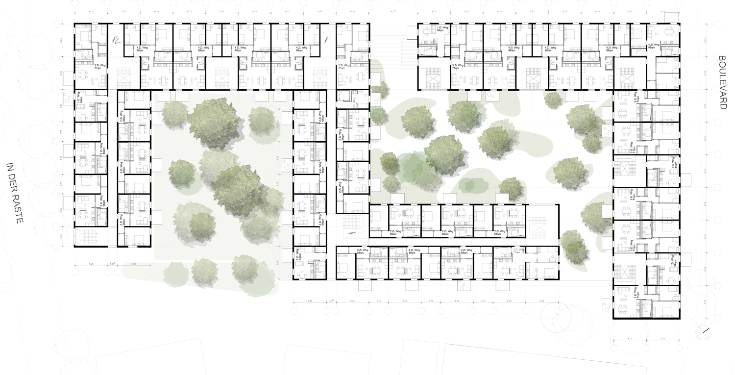 The development concept is based on linking different systems: decentralized stairwells, central corridors with natural lighting and ventilation, and a pergola on the top floor. This allows all cores to be connected directly or indirectly to Dottendorfer Strasse and the boulevard. In principle, the design is based on Goldbeck standards, but different layouts are also possible – from one-room apartments to cluster apartments for shared living. Apartments with individual entrances and private gardens are available on the roof garden.