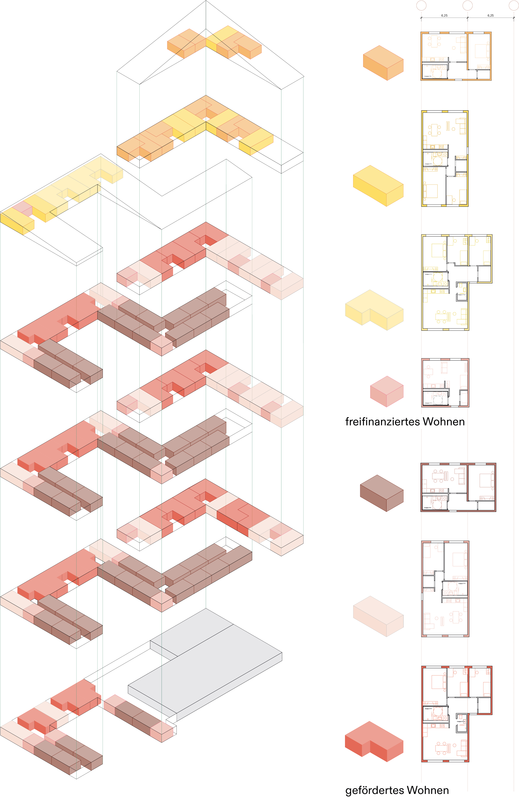The construction fully complies with the Goldbeck system with load-bearing reinforced concrete or masonry bulkheads, non-load-bearing exterior walls, and prestressed hollow core slabs as ceiling construction with a high degree of prefabrication and minimized material usage: concrete minus 50%, steel minus 70%. The underground parking garage is planned as a monolithic reinforced concrete construction. The exterior walls are constructed with highly insulated bricks or aerated concrete and covered with a patchwork of different facade materials: robust bricks on the ground floor and first floor, plaster and pre-greyed wood cladding (rear-ventilated) on the upper floors. A casual mix that facilitates the ideal, individual appropriation by the residents.