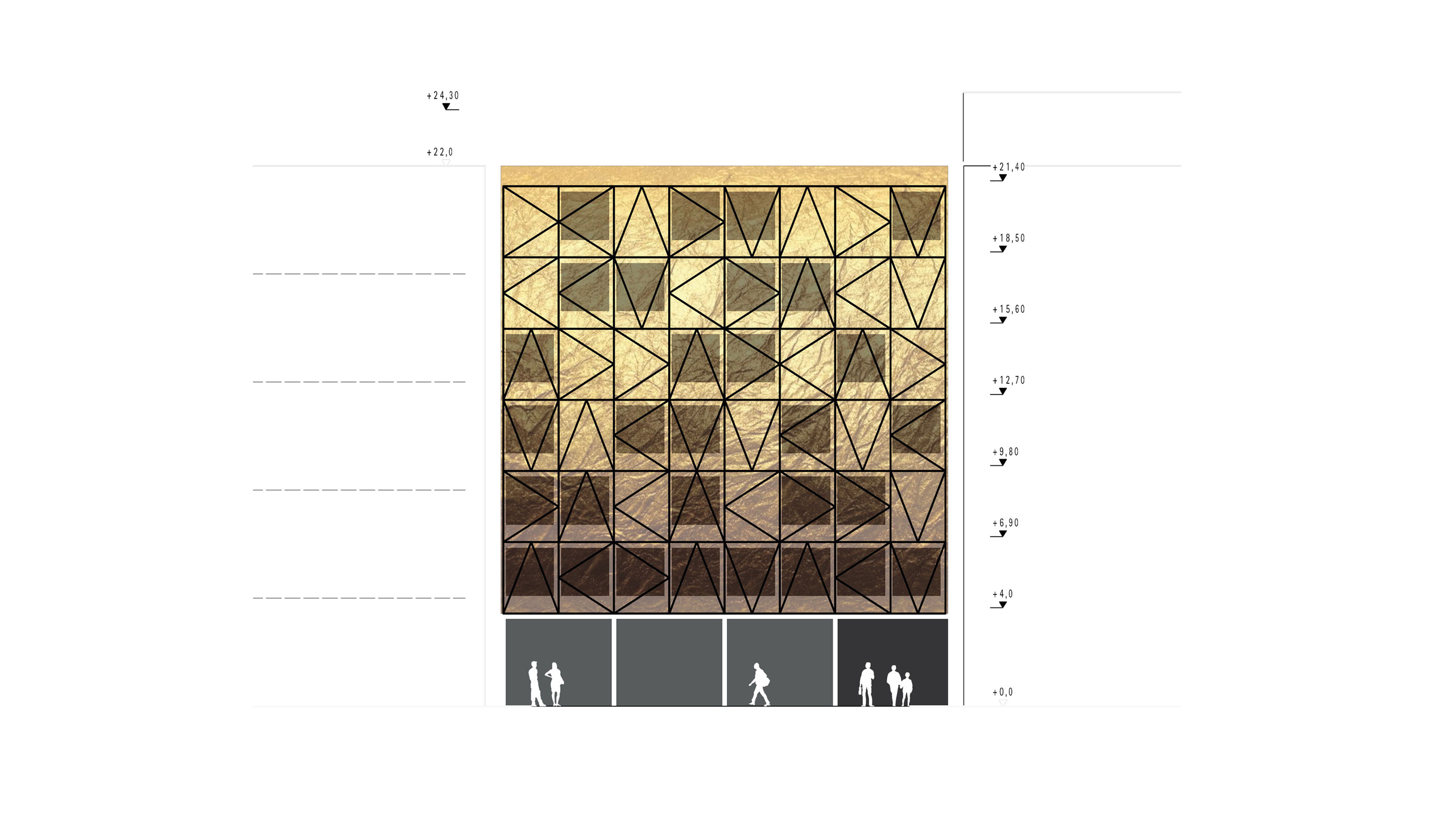 The new building will align with the height of the neighboring structures, blending harmoniously into the existing cityscape. The facade design is inspired by two key elements: firstly, by staggered wooden cubes, which give the building a modern and dynamic structure, and secondly, by Indian culture, reflected in the use of golden tones.