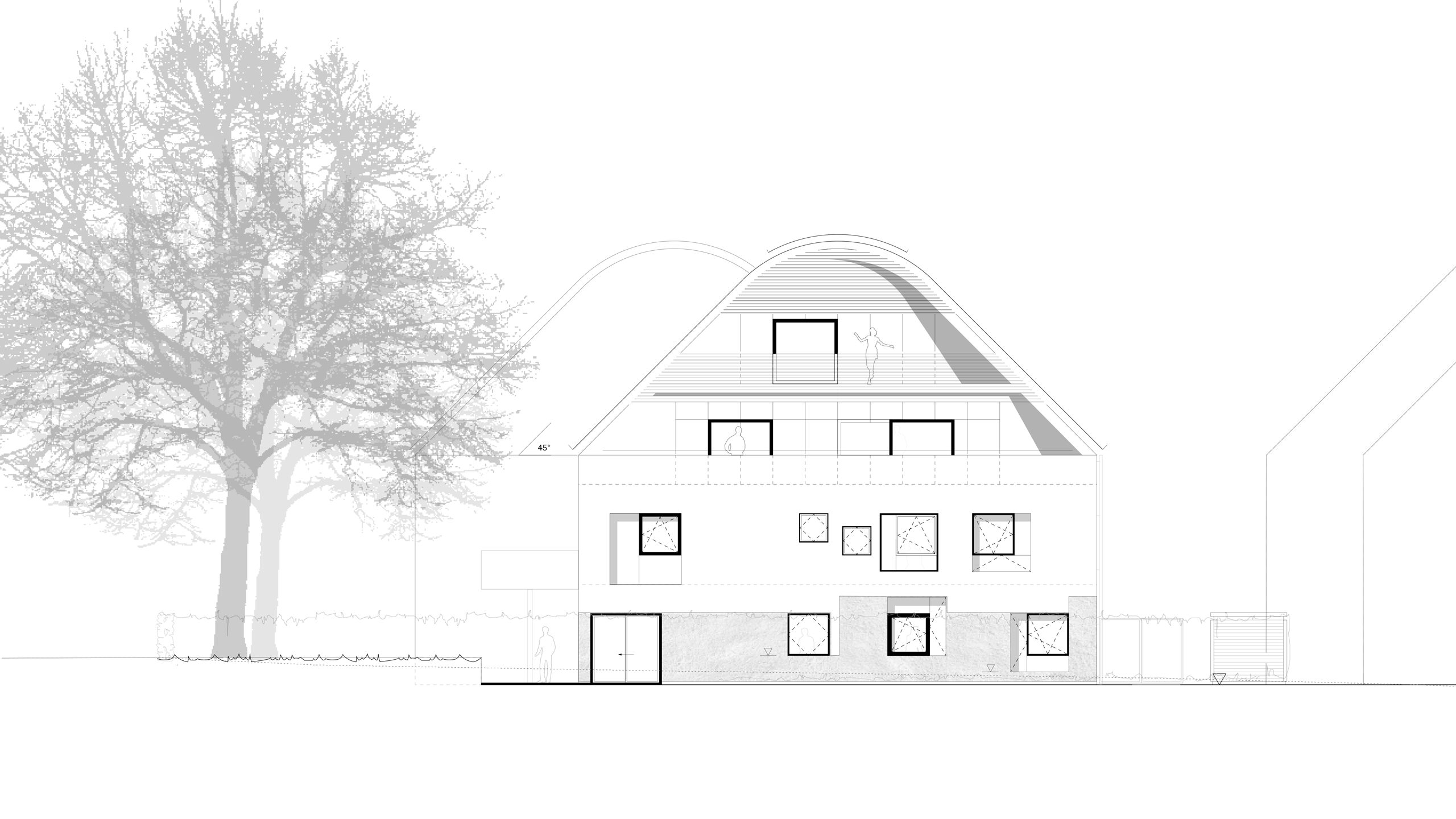 A striking feature of the property is its remarkable collection of trees. This vegetation originated from the creation of a park-like garden on the site and was mapped and assessed a few years ago. Alongside shrubs, ornamental plants, and spontaneous vegetation, the site also contains beeches, copper beeches, and plane trees with trunk circumferences of up to 3.6 meters. The trees and outdoor areas have not been maintained in recent decades, resulting in a dense, forest-like vegetation.