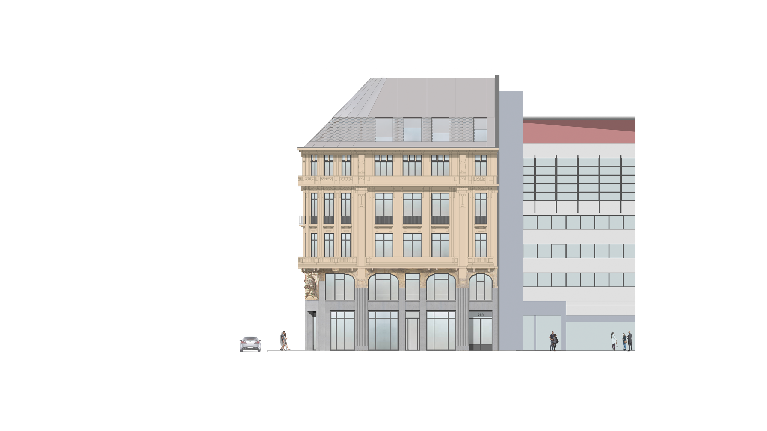 Die vorhandene ornamentierte Sandsteinfassade wird gesäubert und nur wo technisch notwendig originalgetreu repariert. Im Erdgeschoss sind infolge des Kinorückbaus behutsame Ergänzungen im Bereich der Stützen vorgesehen.