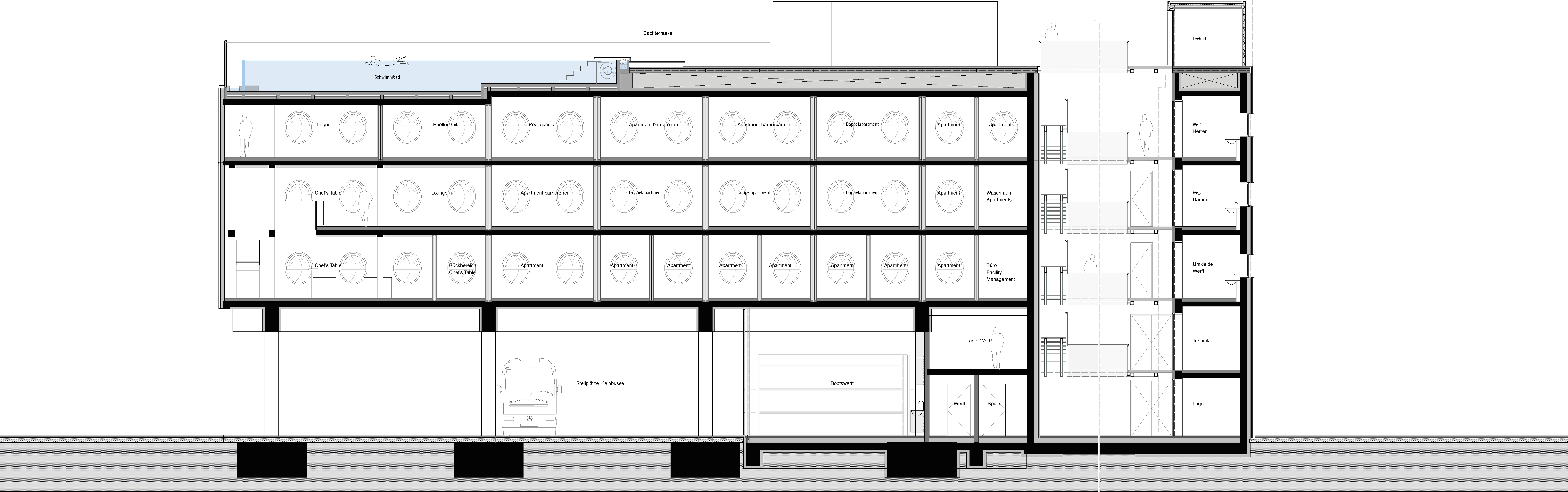 In den Obergeschossen sind 19 Einheiten als Boardinghouse in verschiedenen Größen geplant. Das Boardinghouse ist ein Beherbergungsbetrieb, der auf Gäste mit längeren Aufenthalten ausgelegt ist. Eine Besonderheit bilden die Einheiten vor Kopf zur Wasserseite. Hier ist im ersten und zweiten Obergeschoss ein neues gastronomisches Konzept geplant. Der über beide Geschosse geöffnete Raum soll zukünftig als exklusives Restaurant in wohnzimmerähnlicher Atmosphäre betrieben werden.